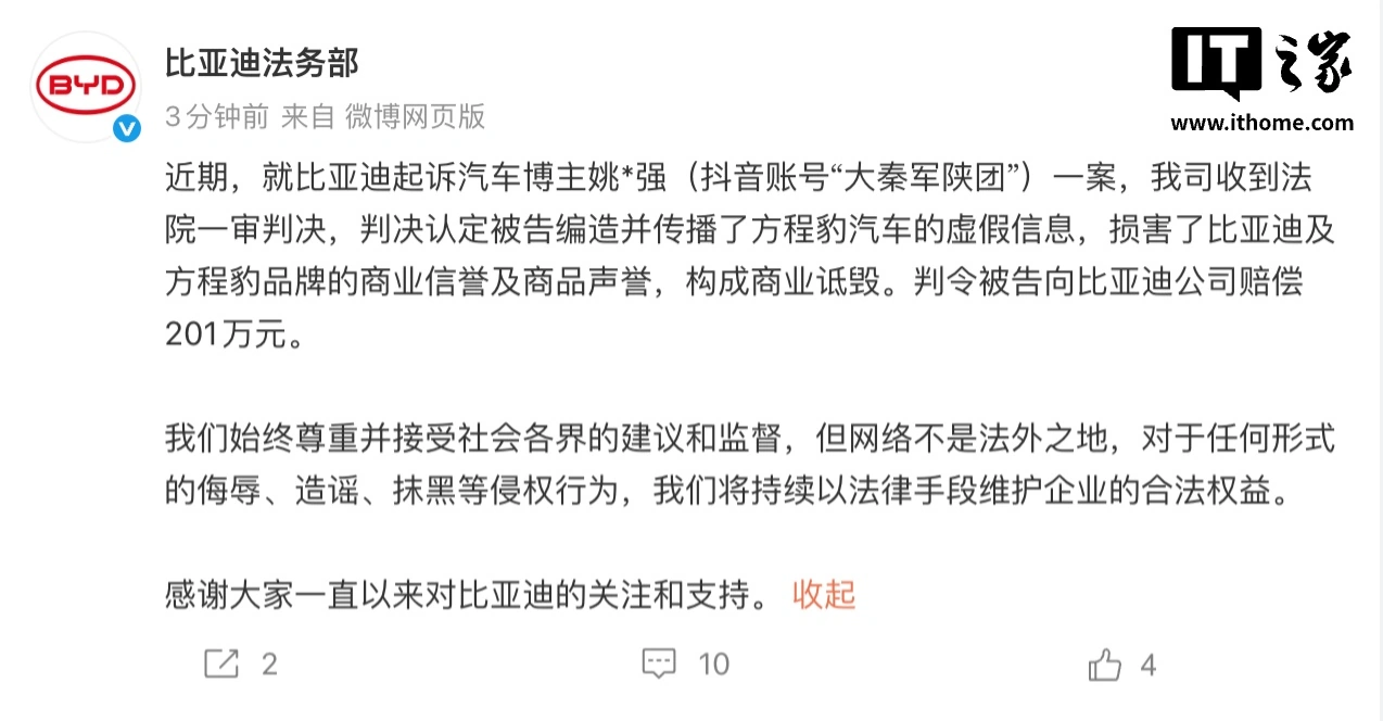 IT之家1月22日消息,今天午间,比亚迪(002594)法务部通过官微发布公告:近期,就比亚迪起诉汽车博主姚*强(IT之家注:抖音账号“大秦军陕团”)一案,公司已收到法院一审判决,判决认定被告编造并传播了方程豹汽车的虚假信息,损害了比亚迪及方程豹品牌的商业信誉及商品声誉,构成商业诋毁。判令被告向比亚迪公司赔偿201万元。