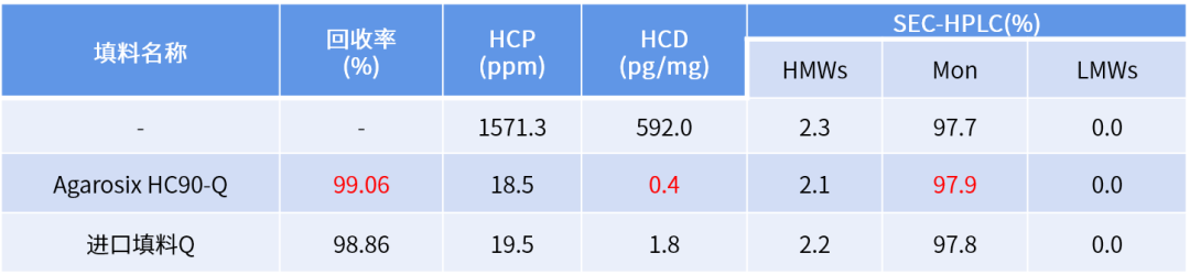 Agarosix HC90-Q与某进口填料的层析性能相当,一步层析能有效去除绝大部分HCP、HCD。